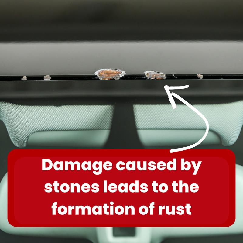 Most often, damage occurs when a pebble flies into the edge of the roof of the car. A pebble pierces the vehicle's paint and varnish down to the metal. This is where rust forms and spreads over the years.